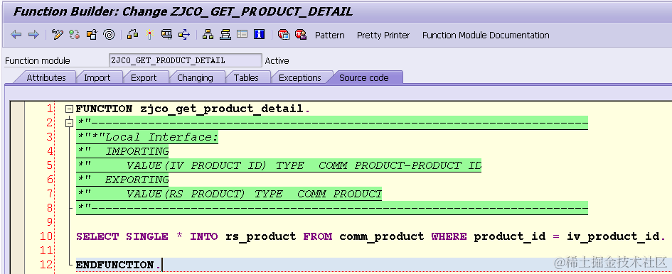 (3) Create a simple remote function module in ABAP. The function module just accepts the product ID passed from JAVA side, and query against it in database table COMM_PRODUCT, and return the query result which will be fetched via JCO in JAVA side. Never forget to mark the “Remote enabled Function module” flag.