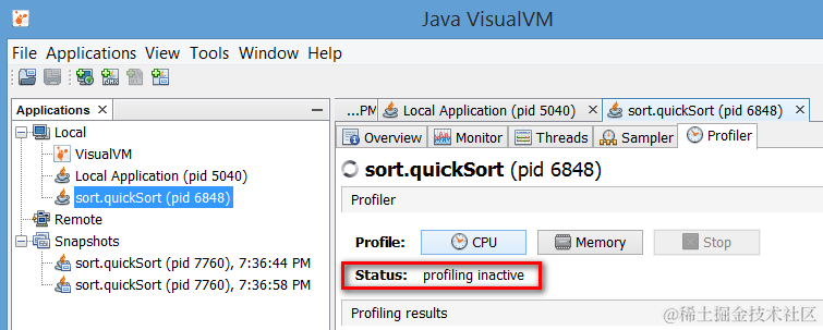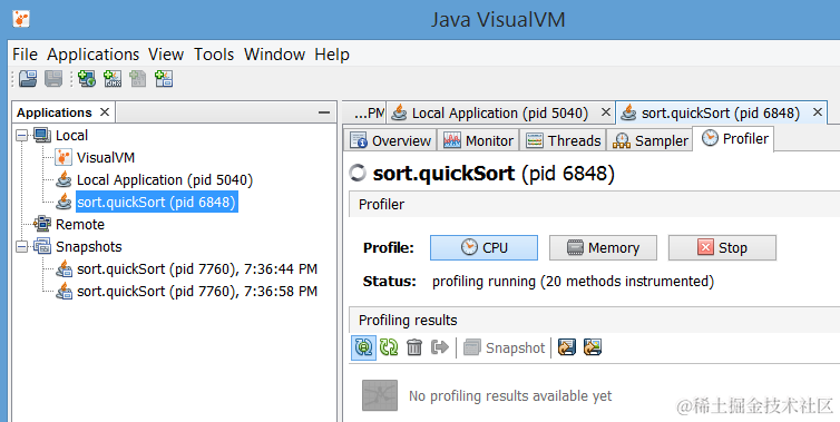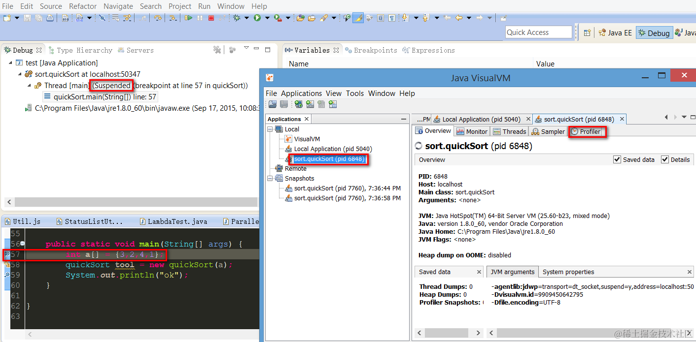 (2) For example I have a Java application which sorts an array by QuickSort algorithm written by myself and I would like to get its performance data, then I set a breakpoint on line 57, before my main logic is executed.