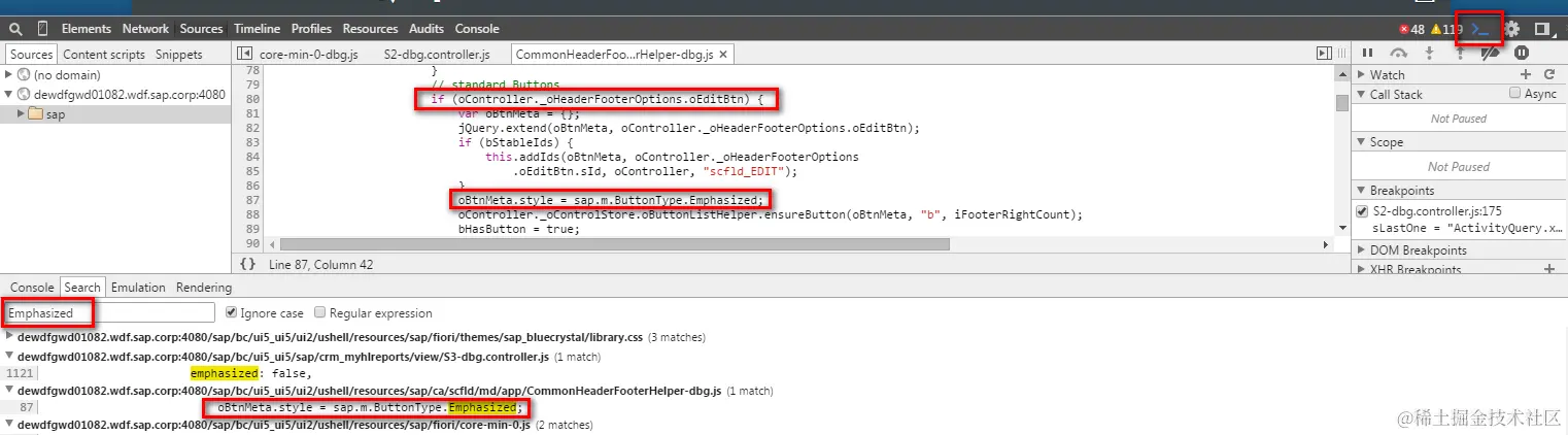 (2) Now we need to know how this CSS style is added by UI5 framework. Search by keyword “Emphasized” and I just find what I look for in a second. In line 80 there is an IF evaluation to check the availability of oEditBtn of variable oController._oHeaderFooterOptions, whose value is filled by we application code.