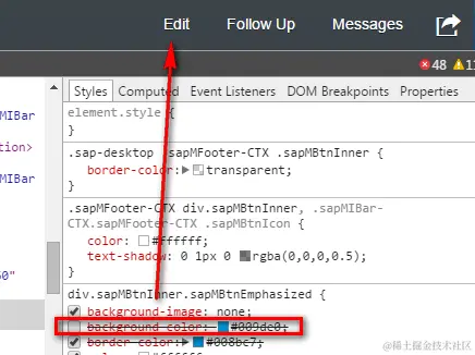 (1) First of all, we need to figure out how the blue background color is implemented in the standard application. Check related controller code regarding footer toolbar button definition, and there is no style definition regarding Edit button. So it must definitely be done by UI5 framework.