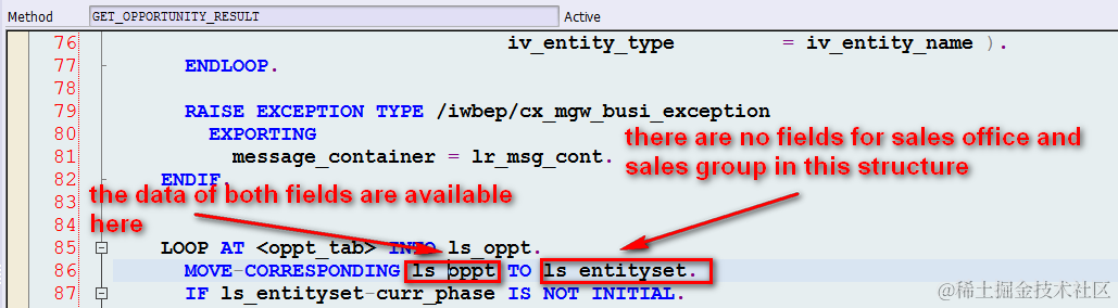 Since there is a MOVE-CORRESPONDING fields to move the opportunity data from one order API result to result structure of odata service, for the read operation, we just need to create two new fields in the structure of ls_entityset with exactly the same name, SALES_OFFICE and SALES_GROUP, then the MOVE-CORRESPONDING will take effect.