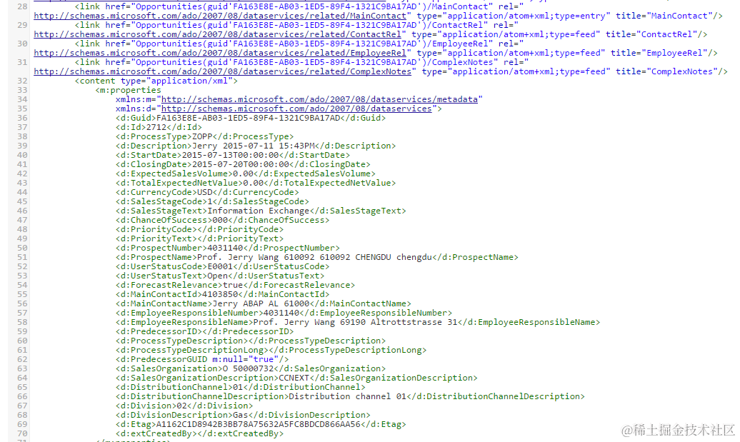 As the first step, we need to expose the read operation of these two fields via odata service, which means when we test the odata service read operation, we expect to see both in response stream. Below is the screenshot of response before extension – both fields are missing there.