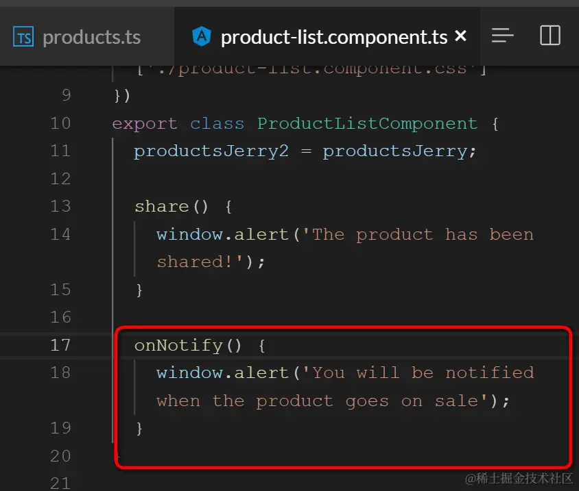 在product alert模板里,给按钮点击click事件附上处理函数:notify.emit()