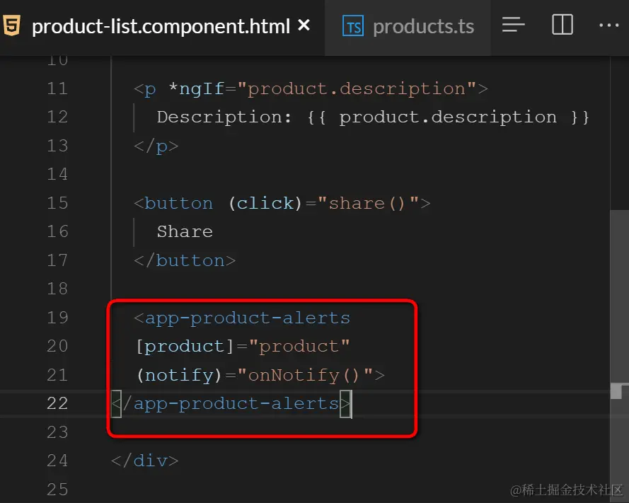 例子:product-list为parent Component,product-alert为child Component.