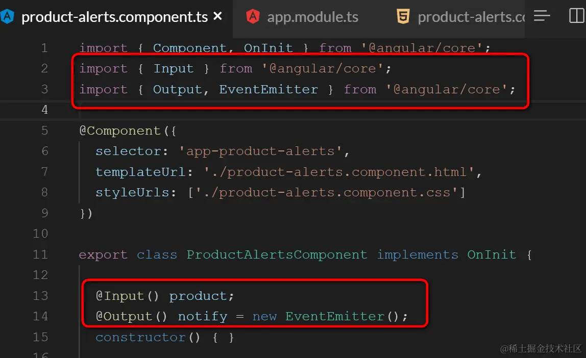 从@angular/core里导入Input, Output和EventEmitter: