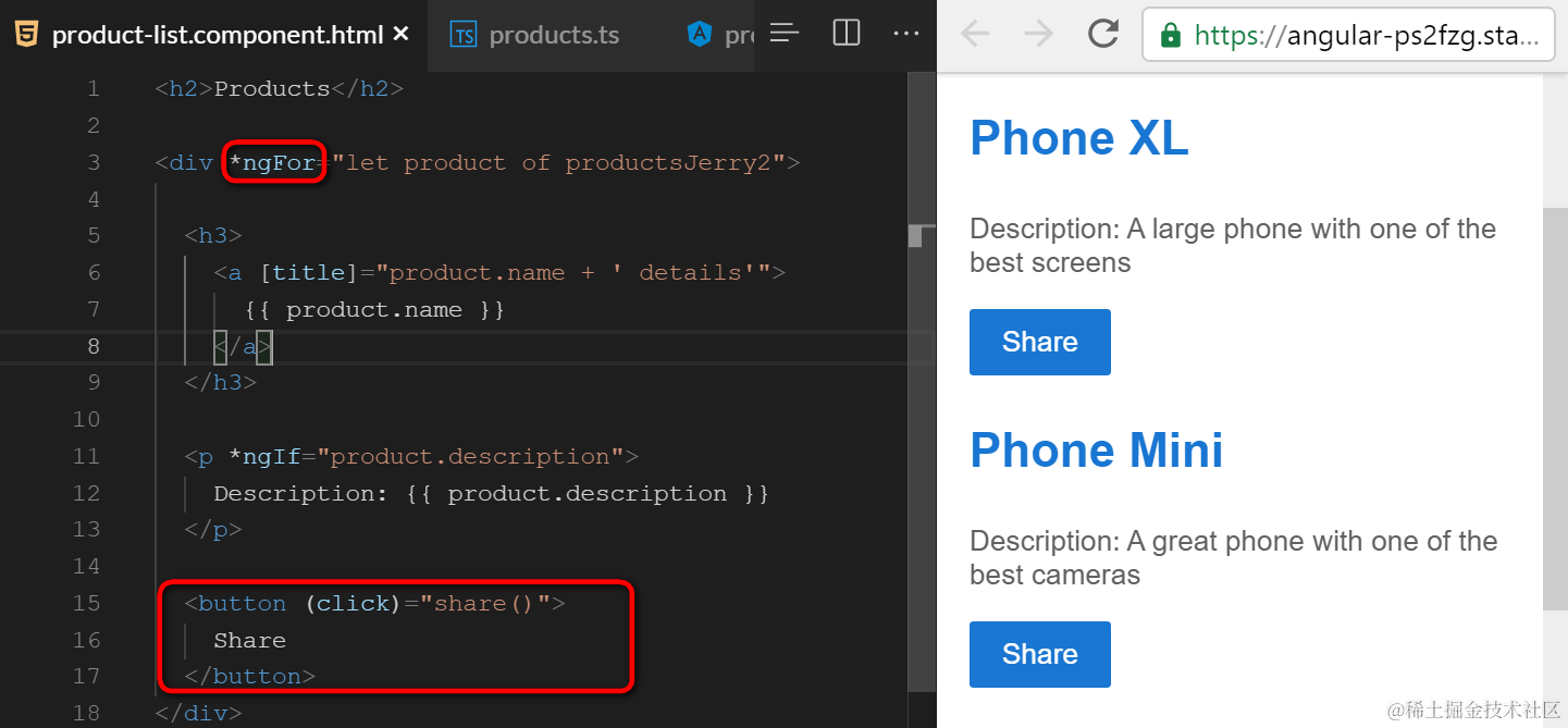 在*ngFor指令内,使用语法(click)="函数名()"的方式给button按钮注册click响应函数: