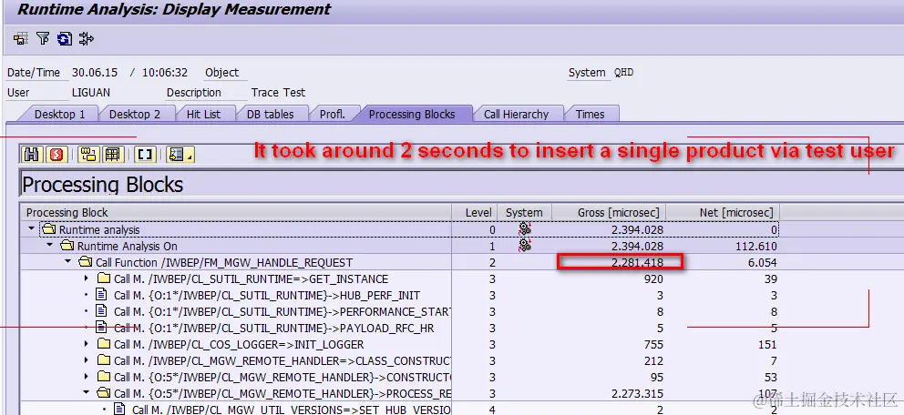 (2) I use transaction code SAT to trace the single product insertion with test user A, it took around 2 seconds. It seems the execution time increases linearly with the number of product to be inserted. Also the 2 seconds for a single product insertion is not acceptable – too slow!!