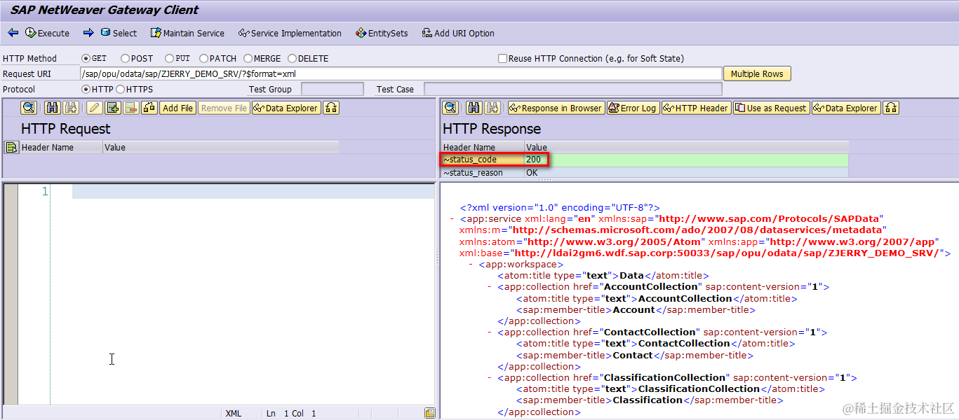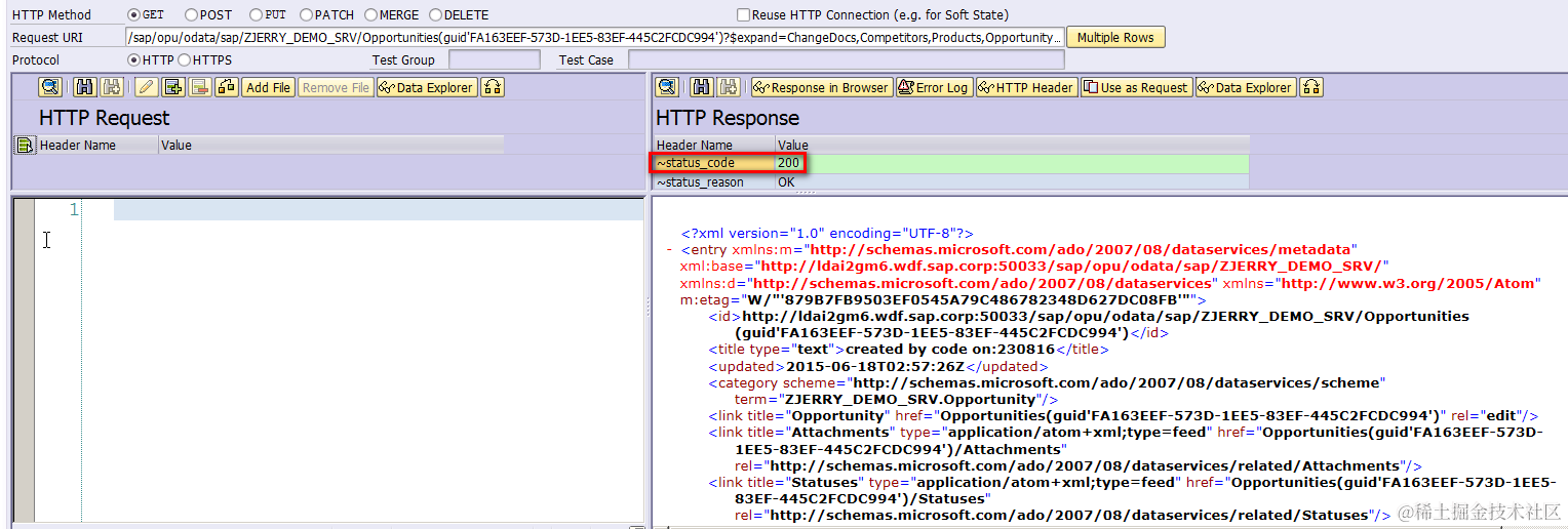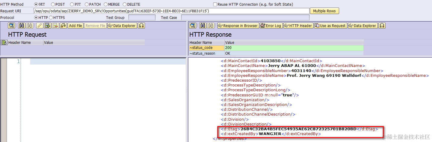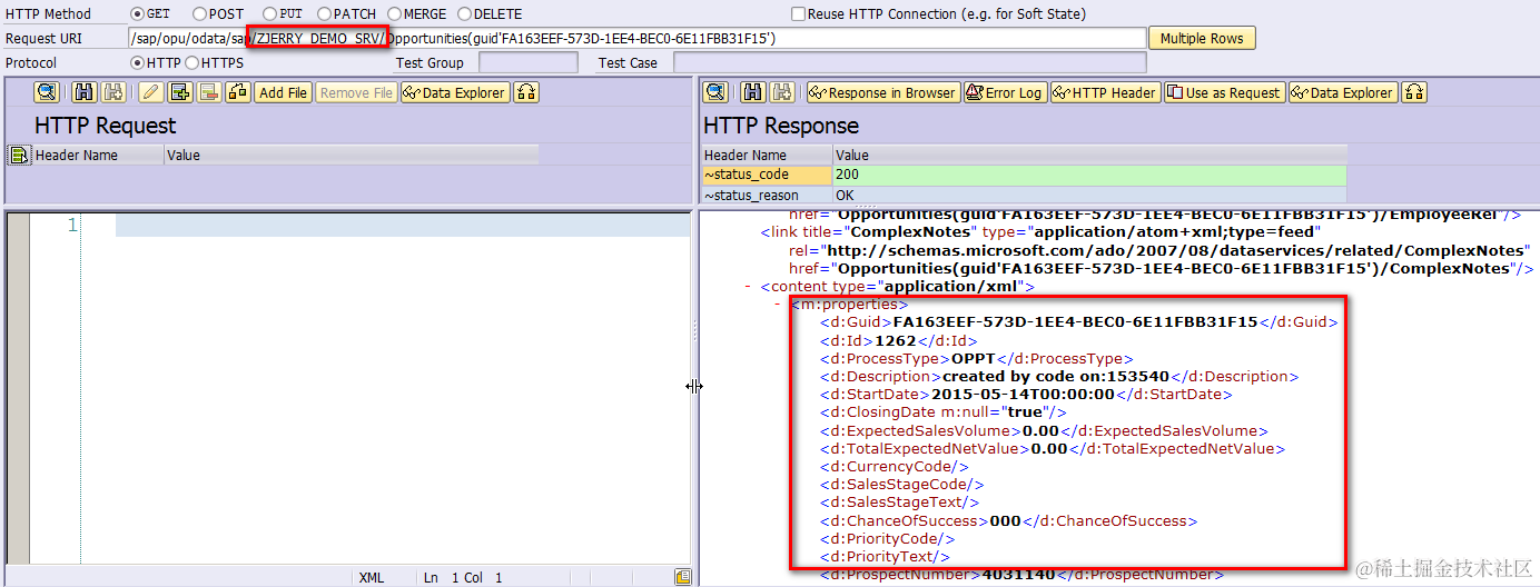 Test whether read operation on given Opportunity instance specified by guid also works or not. Just replace the standard service name CRM_OPPORTUNITY with your own one: ZJERRY_DEMO_SRV: