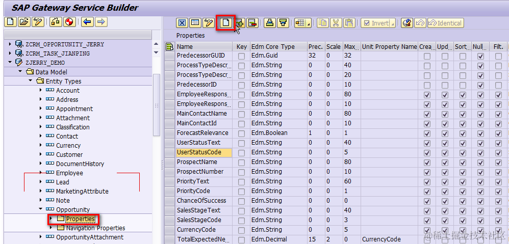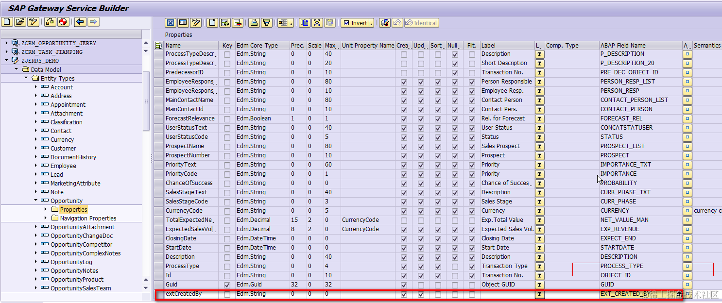 go to tcode SEGW, extend the OData model as well. Double click on the folder icon “Properties” of Opportunity node, create a new field: