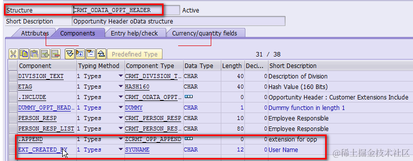 The first step is to figure out which DDIC structure you need to extend. In this example, since I need to extend Opportunity header, so I just look into data type TS_OPPORTUNITY defined in Opportunity MPC ( metadata provider class ),