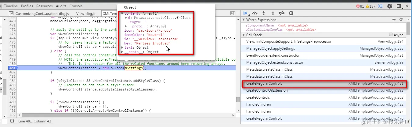 (2) All the controls defined in opportunity detail view (an xml view ) are rendered one by one. As this is an xml view, the method in XMLTemplateProcessor.js is called. The screenshot below shows the time-slot when the “Participants” tab is to be rendered.