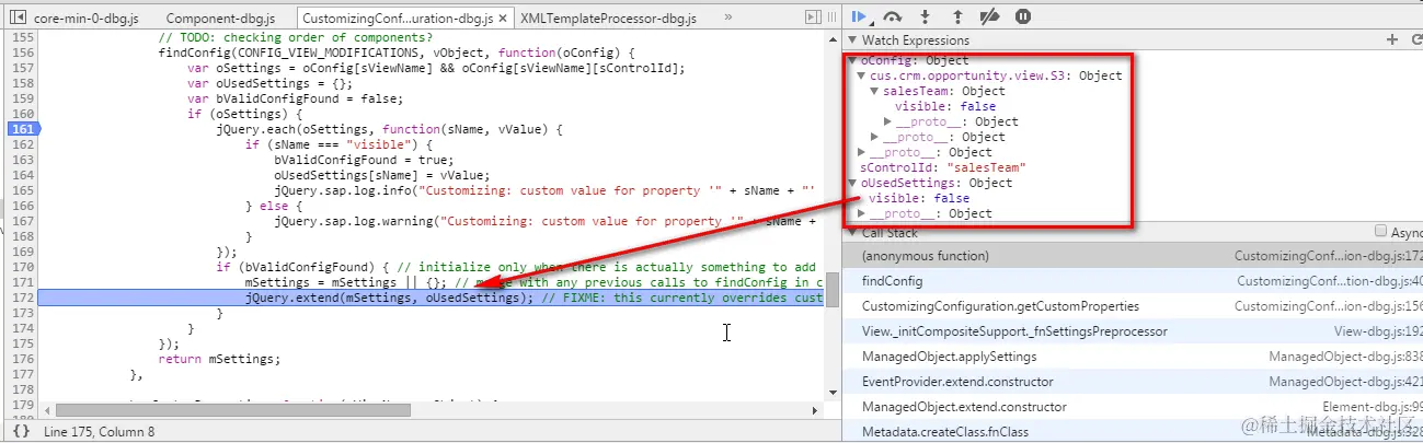 (3) Then the visible configuration parsed from step 1 is merged into standard settings mSettings via the jQuery.extend method: