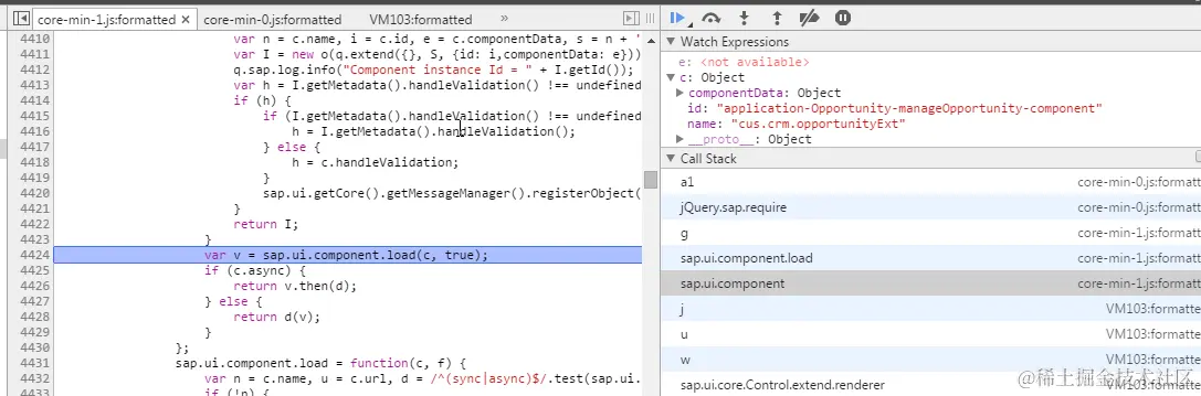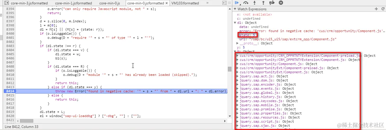 Now the reason of this “negative cache” is clear: there is a global array M which stores all currently loaded modules with their url and state. Since the module to be loaded when I click the tile of my extension project, “cus.crm.opportunity.Component.js”, has error state ( 5 ), the corresponding error is raised.
