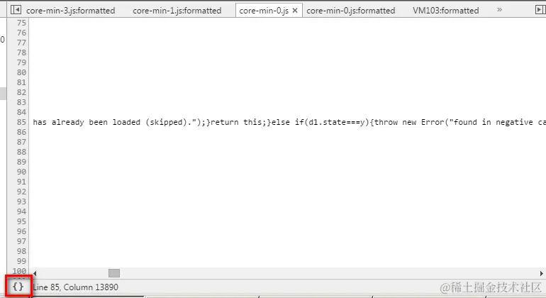 click it, and Chrome will bring us to the exact code where this error occurs. Click the bracket icon to format the code: