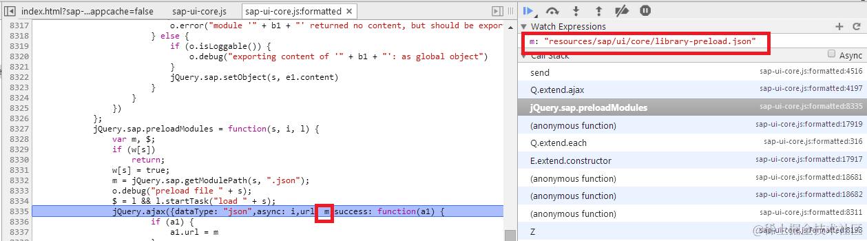 type “m” in Watch Expressions tab, and then you can see the url for “library-preload.json”. This AJAX call generates the very entry in Network tab in the third screenshot of this document.
