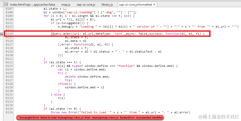 After pretty print format, you will see the line of code which raises the syntax error ( line 8136 ). And in line 8114, the AJAX call is just what we have found via approach1.