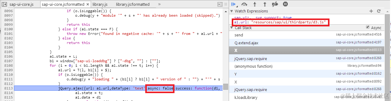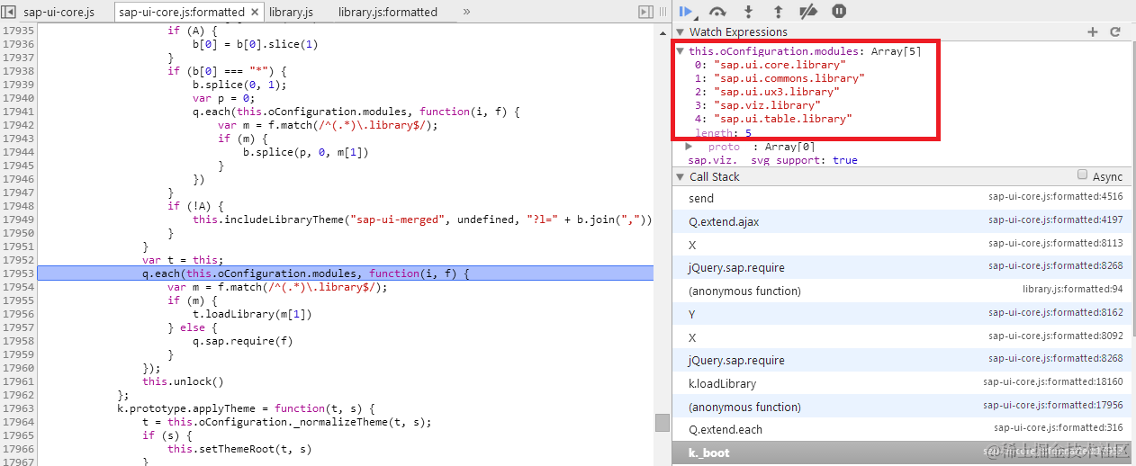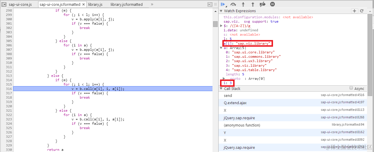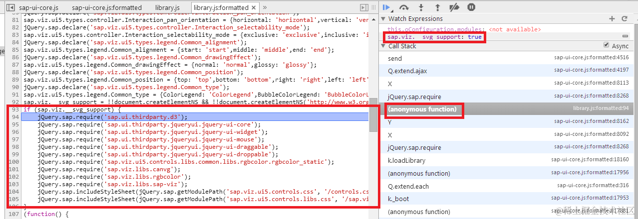 These five libraries will be loaded one by one in a for loop. And currently the third loop is working on sap.viz.library.