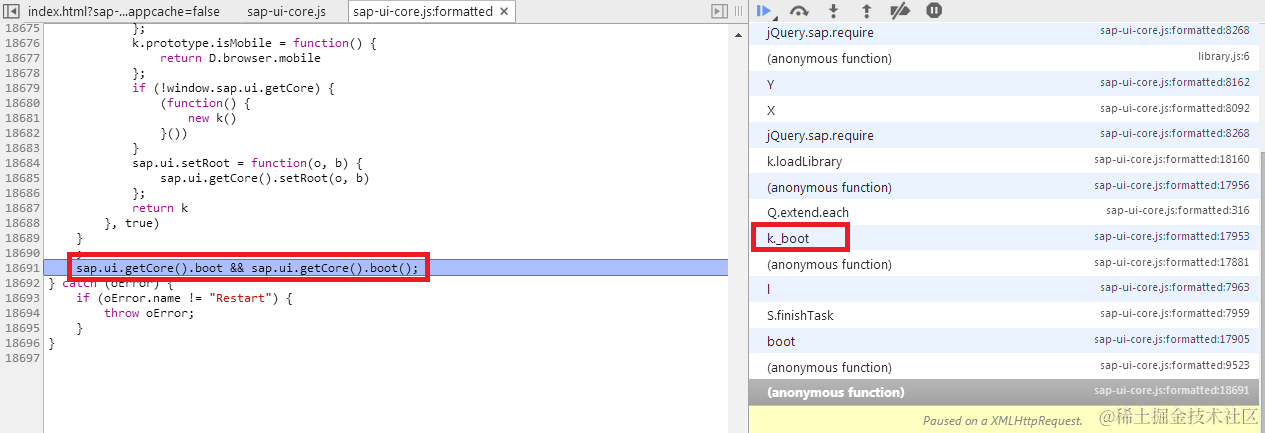 Enable XHR Breakpoint, and type your application url in Chrome and press enter key. The breakpoint will be triggered for loading ui core library. Click callstack “jQuery.sap.preloadModules”.