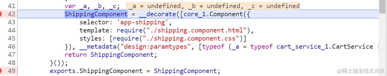 最后,从@angular/core导入的core_1.Component, 经过装饰器函数__decorate处理之后,返回ShippingComponent,被赋给exports的ShippingComponent属性,这样其他Component就可以通过import导入这个Component了。