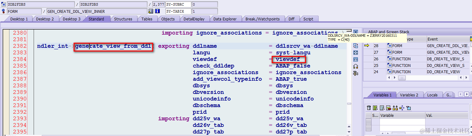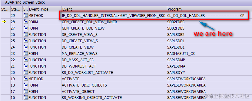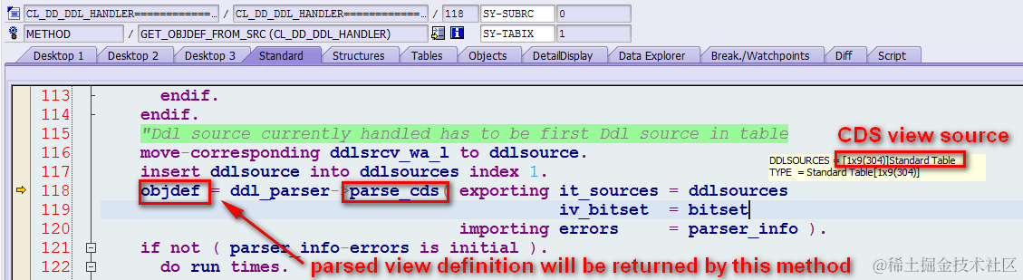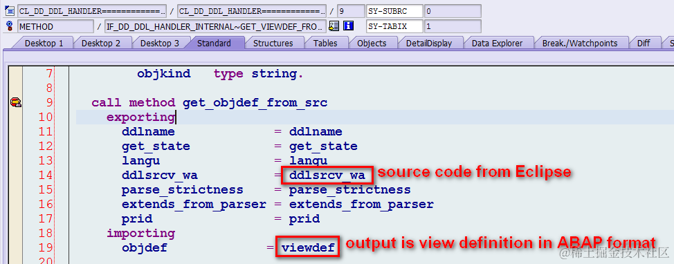 From the callstack we find a class CL_DD_DDL_HANDLER which implements interface IF_DD_DDL_HANDLER which seems is what we look for. Open this class and there is a method GET_VIEWDEF_FROM_SRC, which indicates the method converts the SouRCe code to ABAP VIEW–DEFinition. Set breakpoint in it and click activate button again in Eclipse.