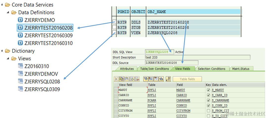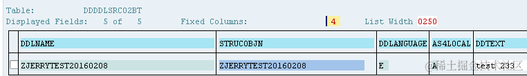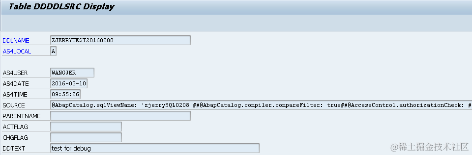 Query this table by specifying DDLNAME as CDS view name we specified in ABAP development studio, the name after keyword “define view” : Zjerrytest20160208, and we can find view source code stored in field SOURCE.