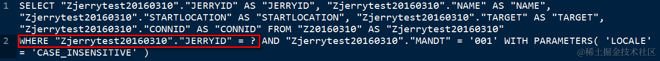 SELECT "Zjerrytest20160310"."JERRYID" AS "JERRYID", "Zjerrytest20160310"."NAME" AS "NAME", "Zjerrytest20160310"."STARTLOCATION" AS "STARTLOCATION", "Zjerrytest20160310"."TARGET" AS "TARGET", "Zjerrytest20160310"."CONNID" AS "CONNID" FROM "Z20160310" AS "Zjerrytest20160310" WHERE "Zjerrytest20160310"."MANDT" = '001' WITH PARAMETERS( 'LOCALE' = 'CASE_INSENSITIVE' )
