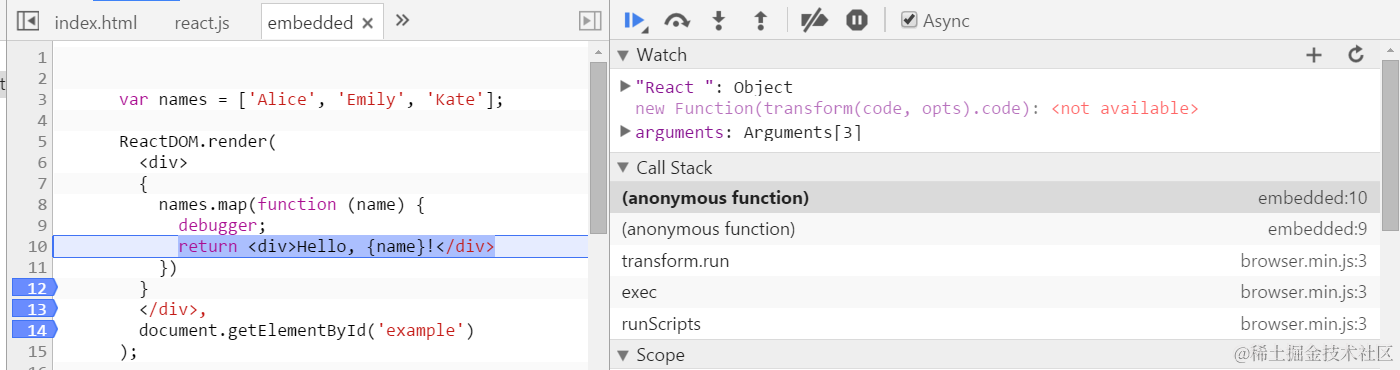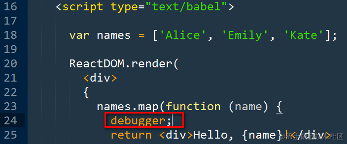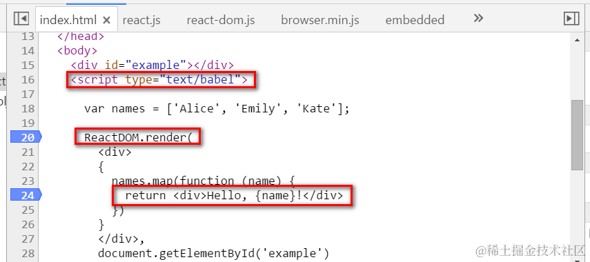 If you would like to debug line 20 and 24 and set a JavaScript breakpoint there, the breakpoint can never be triggered, since the source code is written with a combination of both JS and JSX( the code wrapped with “<>” will be parsed based on HTML rule, and “{}” with JavaScript rule. Pay attention to the type “text/babel” in line 16 ).