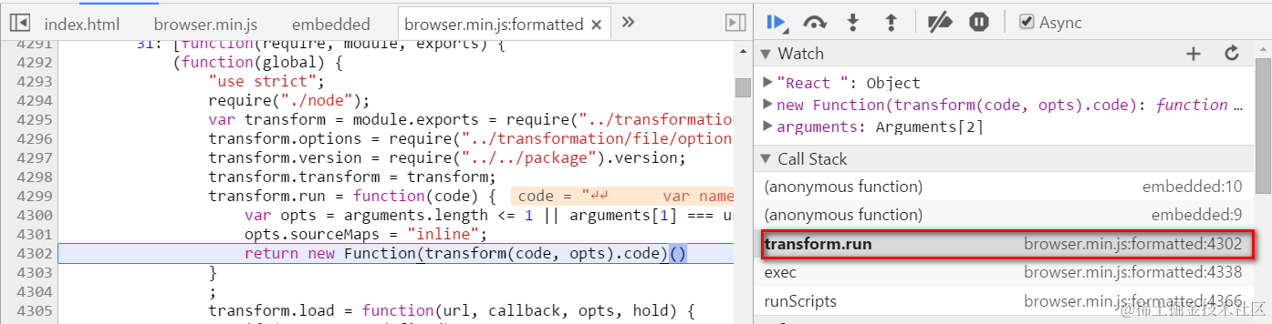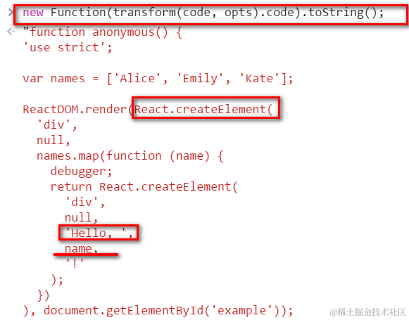 Go to console and type “new Function(transform(code, opts).code).toString();”, then you can see the converted source code: