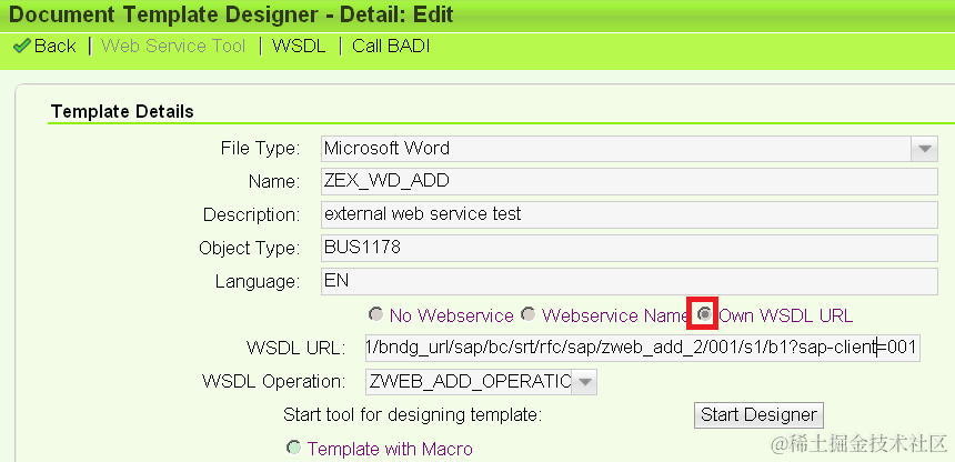In document creation UI, choose radio box “Own WSDL URL”, paste your web service WSDL URL to input field and press entry key, then your web service operation will appear in drop down list automatically. Choose your operation and click button “Start Designer”.