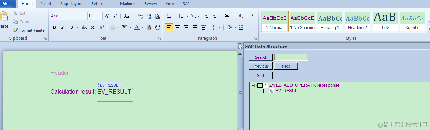 Now a new word document is opened. You could drag the output variable EV_RESULT from SAP Data panel to your word body area.