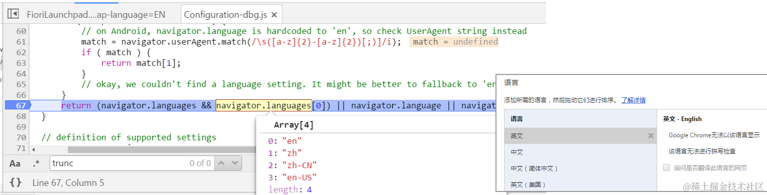 UI5 runtime will use the first Language configured in browser as primary language for all subsequent language-specific configuration stuff load mechanism, as illustrated in line 67 below: