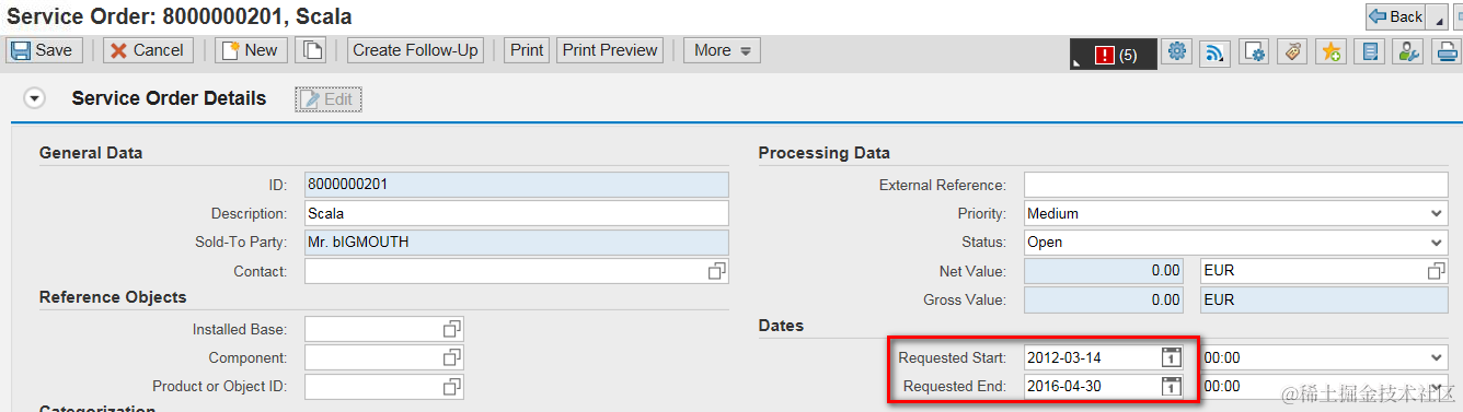 I use a simple report below to illustrate the process how to get requested start and end date starting from Service order guid: