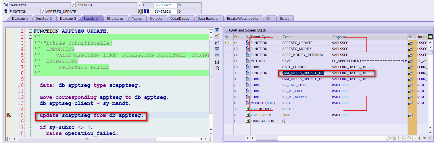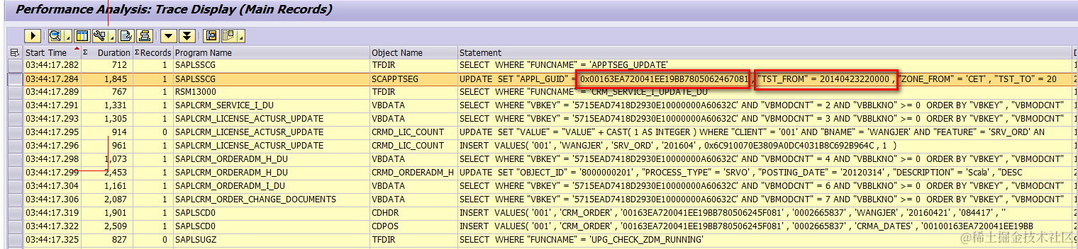 You could find one record whose UPDATE statement contains the changed date you maintained in WebUI, which indicates the table SCAPPTSEG is what we are looking for.