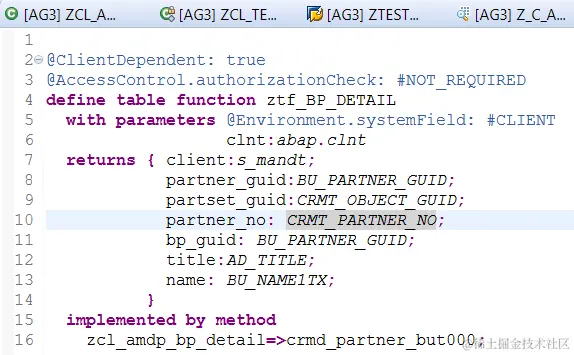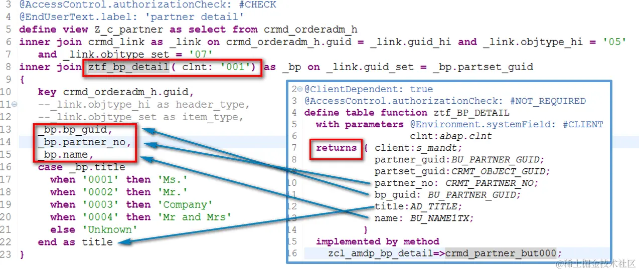 With keyword “with parameters”, the client parameters is defined which works as the importing parameters for the ABAP class method zcl_amdp_bp_detail=>crmd_partner_but000. The keywords “returns” defines available fields which could be consumed by other CDS entities.