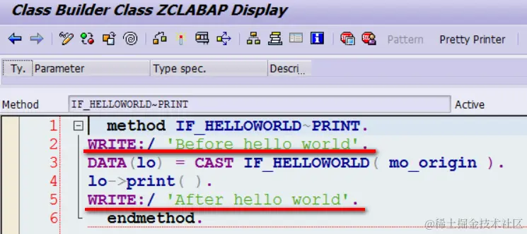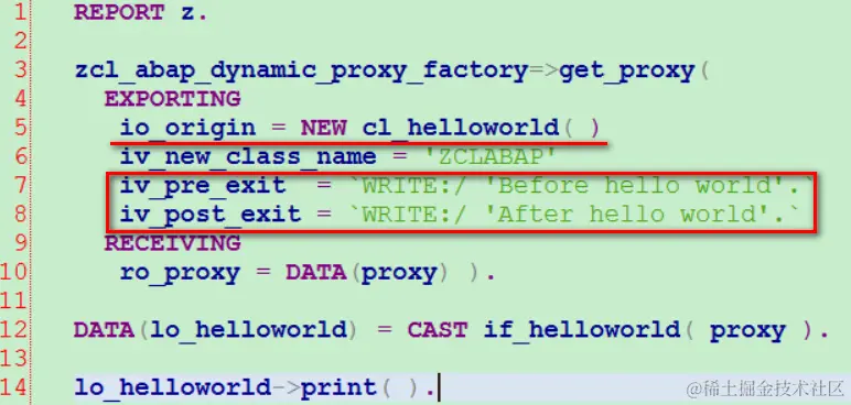 (1) The original instance of class CL_HELLOWORLD is passed to GET_PROXY method. Inside this method, it will inject the pre exit and post exit logic into the original implementation of print method. The injection is done in a new class, whose name is passed via parameter iv_new_class_name, in this example, ZCLABAP.