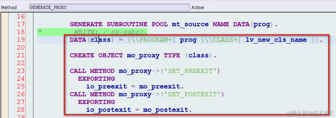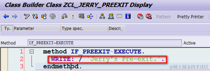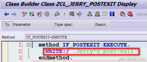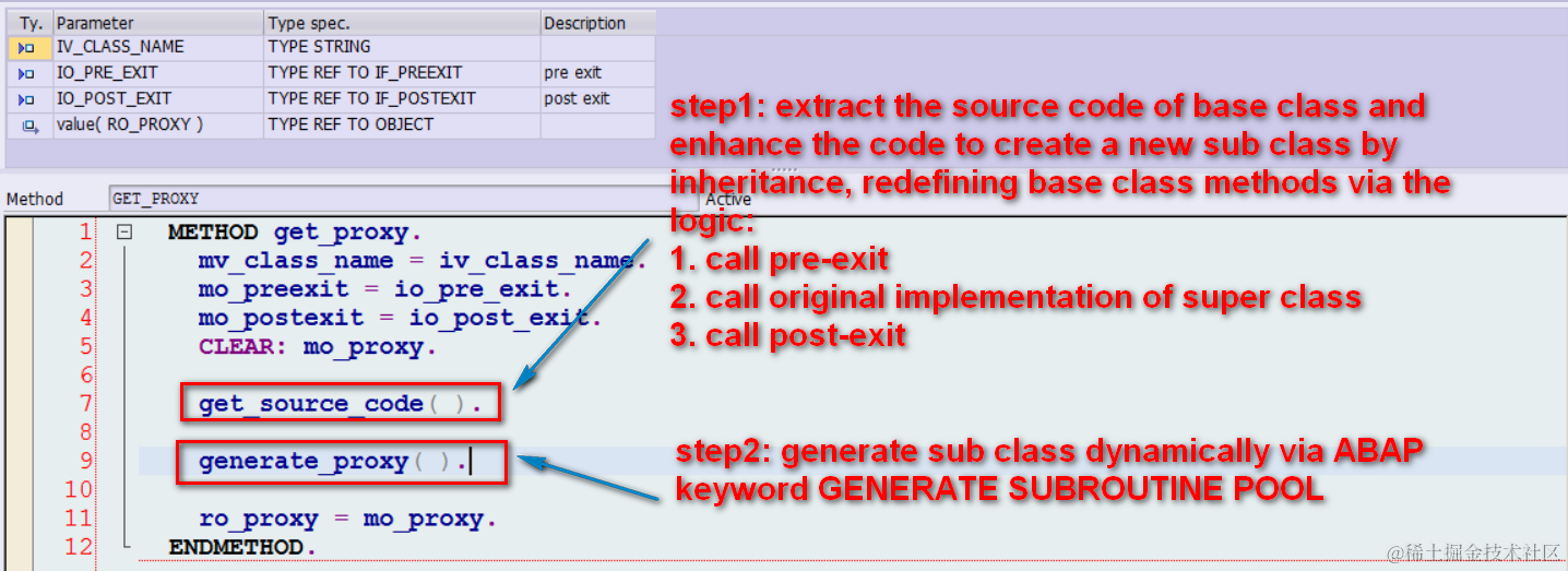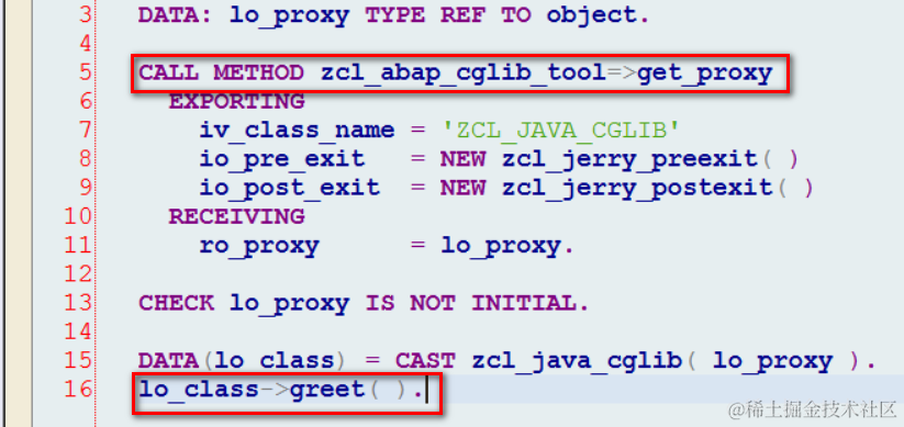 (2) The CGLIB utility class in line 5 simulates the logic in Java, which will construct a proxy class based on existing global class ZCL_JAVA_CGLIB. The generated proxy class will be DYNAMICALLY injected with two enhancement implemented by zcl_jerry_preexit and zcl_jerry_postexit.