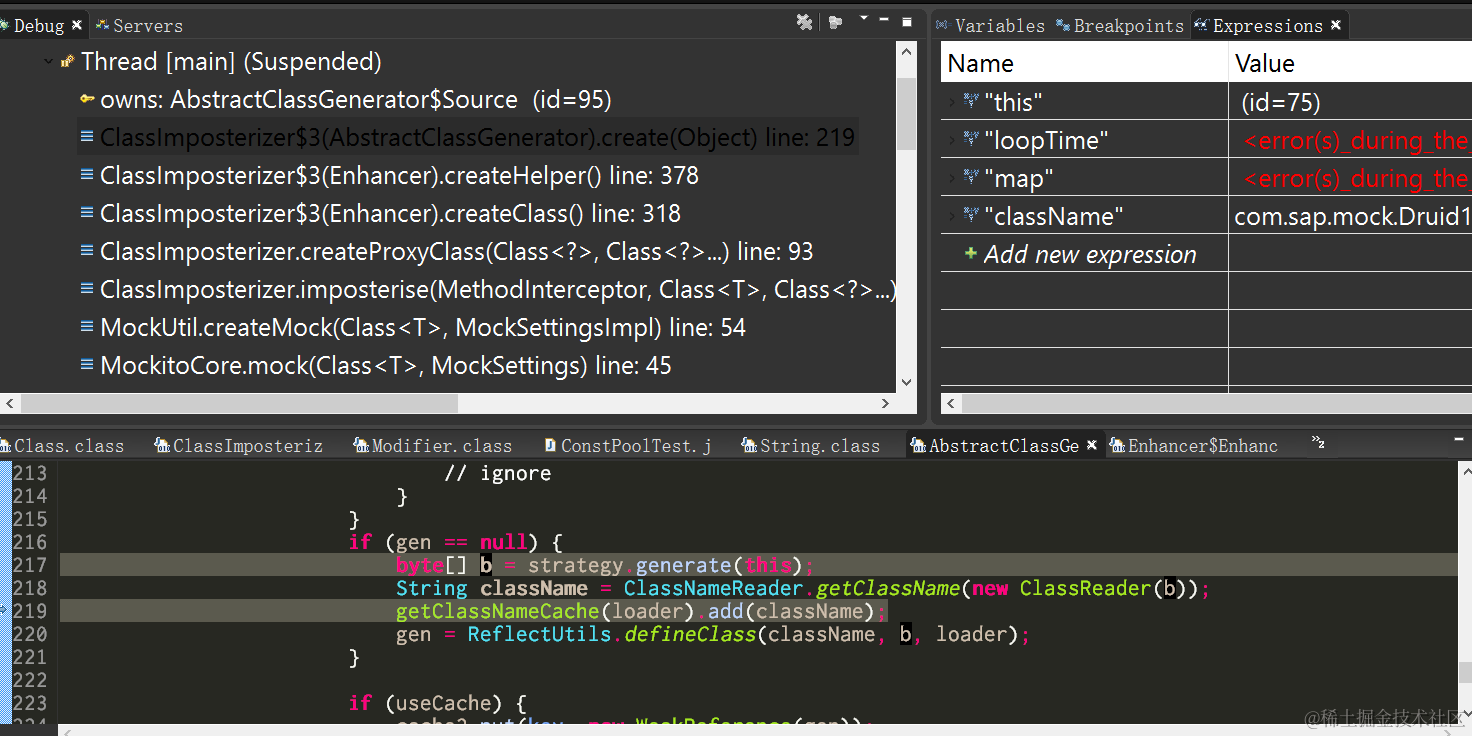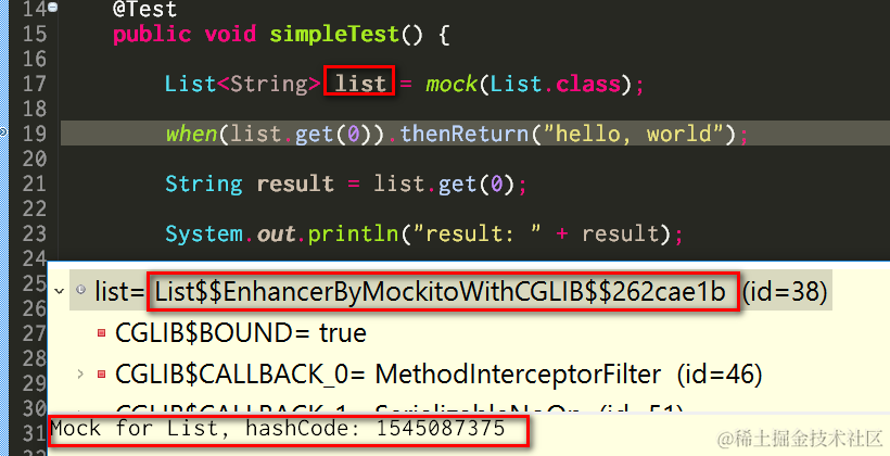 In debugger you can find that the variable in line 17 is mocked by CGLIB: