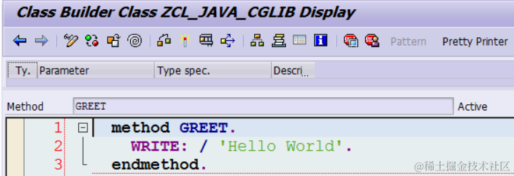 (1) I have a very simple ABAP class with only one public method which will print “Hello World”: