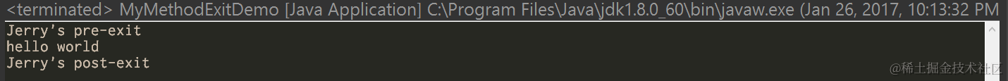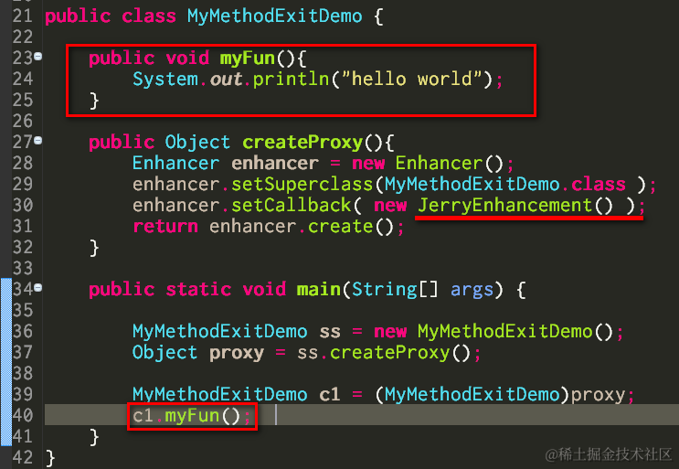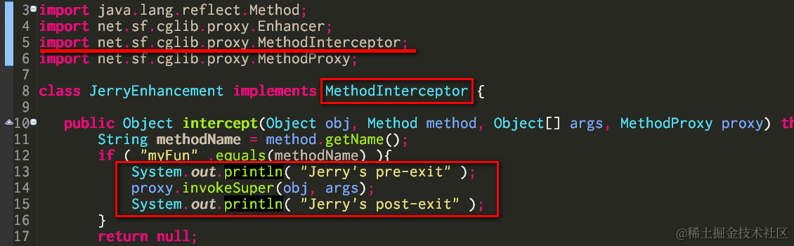 (3) The pre-exit and post-exit are defined in class JerryEnhancement which implements interface MethodInterceptor defined in CGLIB library. The original method is generated in line 14, with pre-exit before it ( line 13 ) and post-exit after it ( line 15 ).
