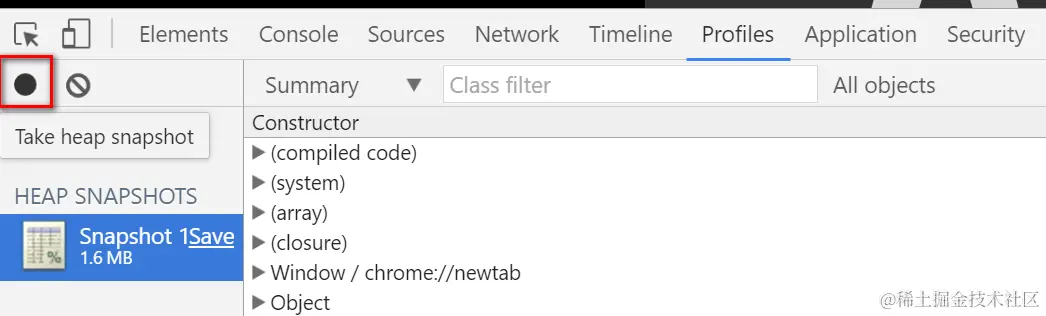 Create a new empty tab in your Chrome, and first create a snapshot with empty heap status by click “Take Snapshot” button: