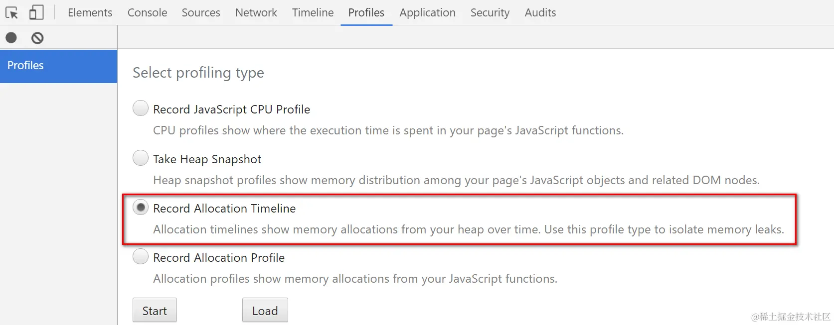 There is another kind of profile in Chrome development tool which can give you an overview about timeline of memory allocation: