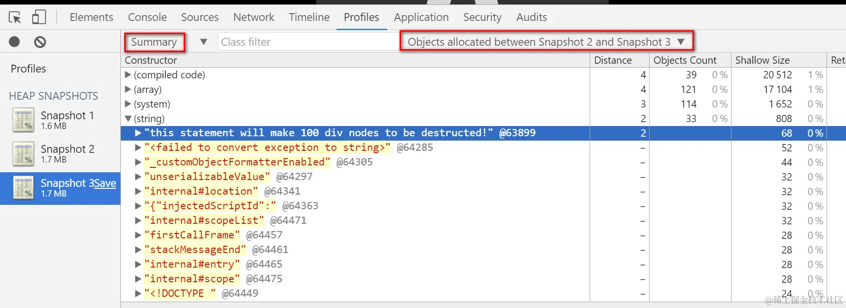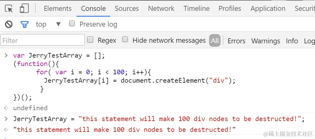 Once done, make the third snapshot and compare it with the second. Now we can find that the re-assignment to JerryTestArray will trigger the destruction of those 100 div nodes by Garbage collector:
