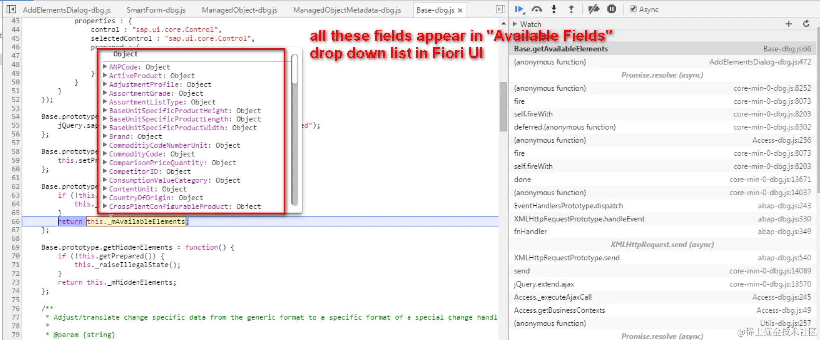 Through debugging, I find the field list are retrieved from property “customFieldAvailable” in SmartForm control.