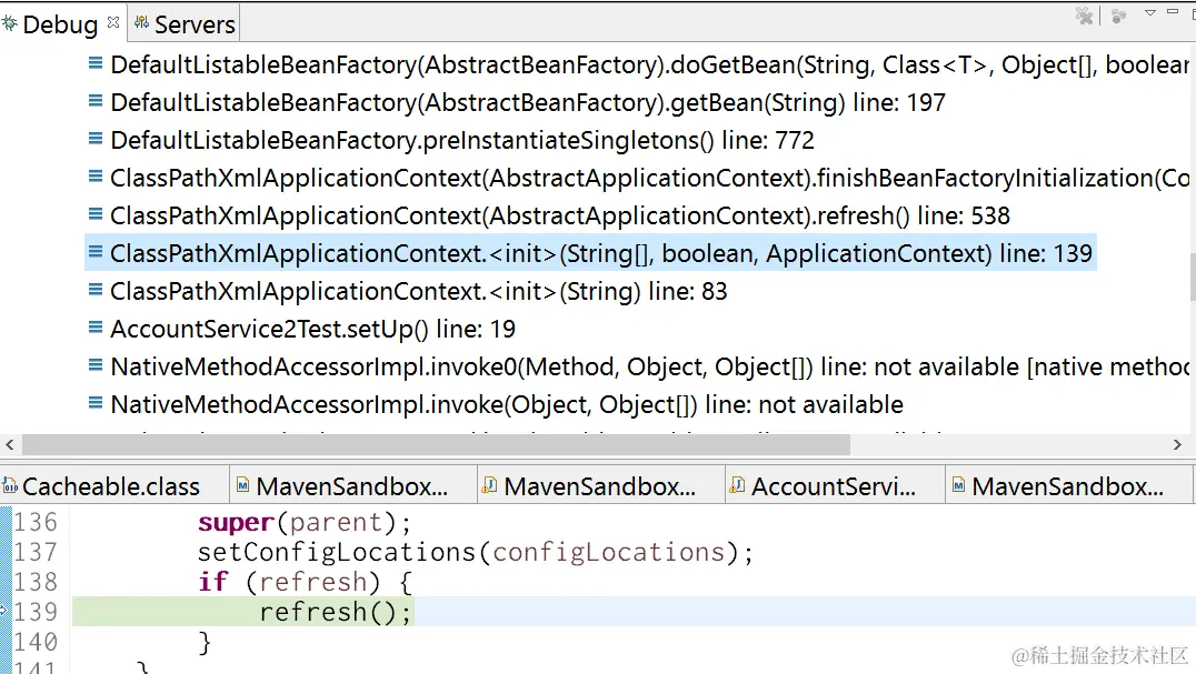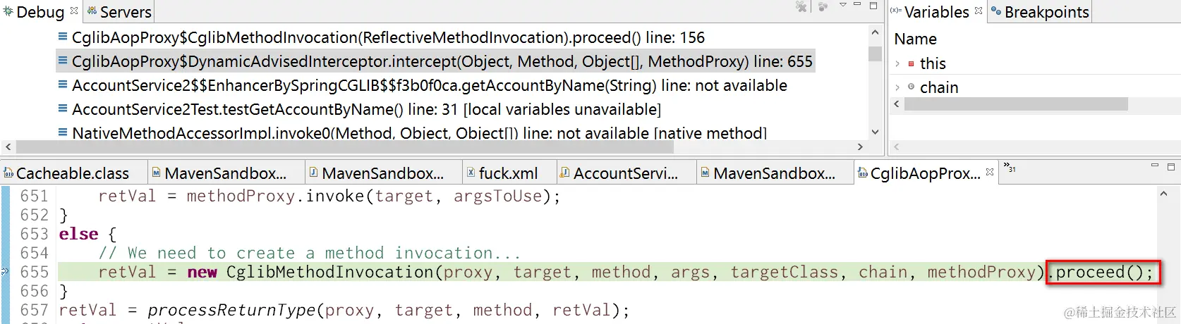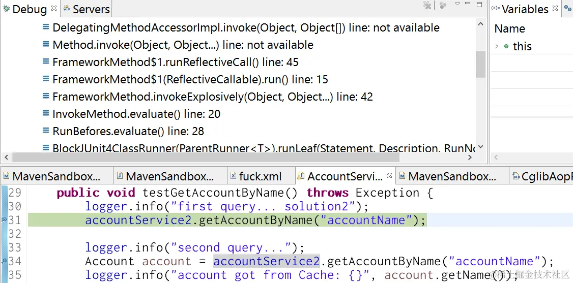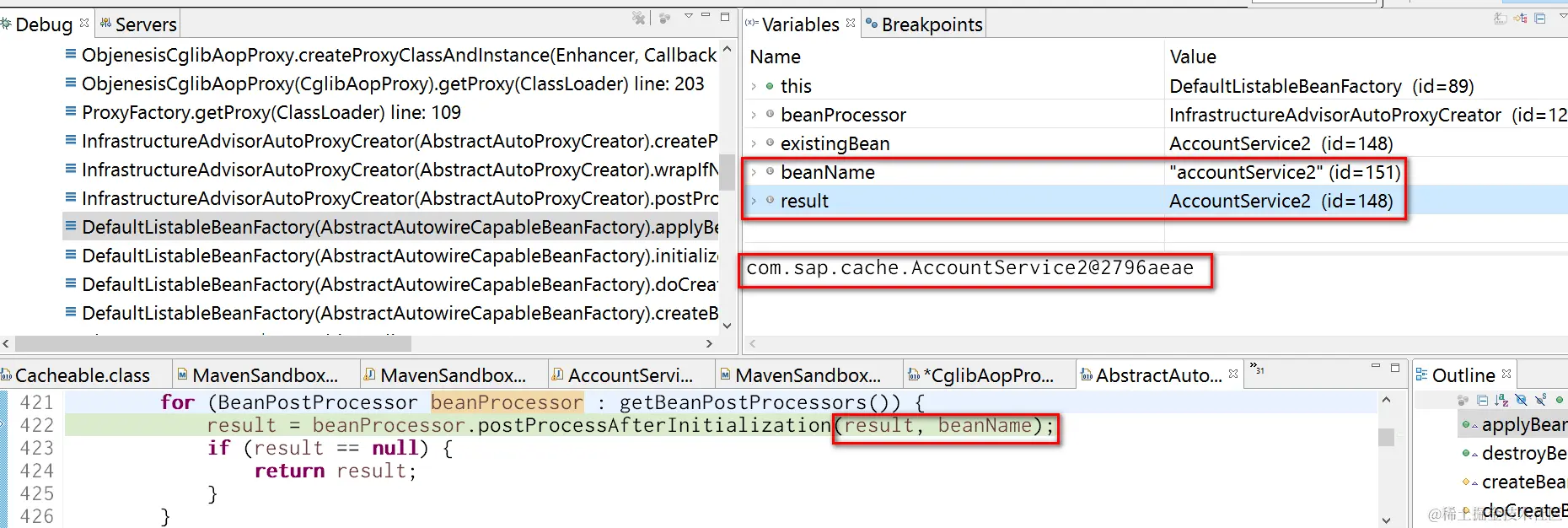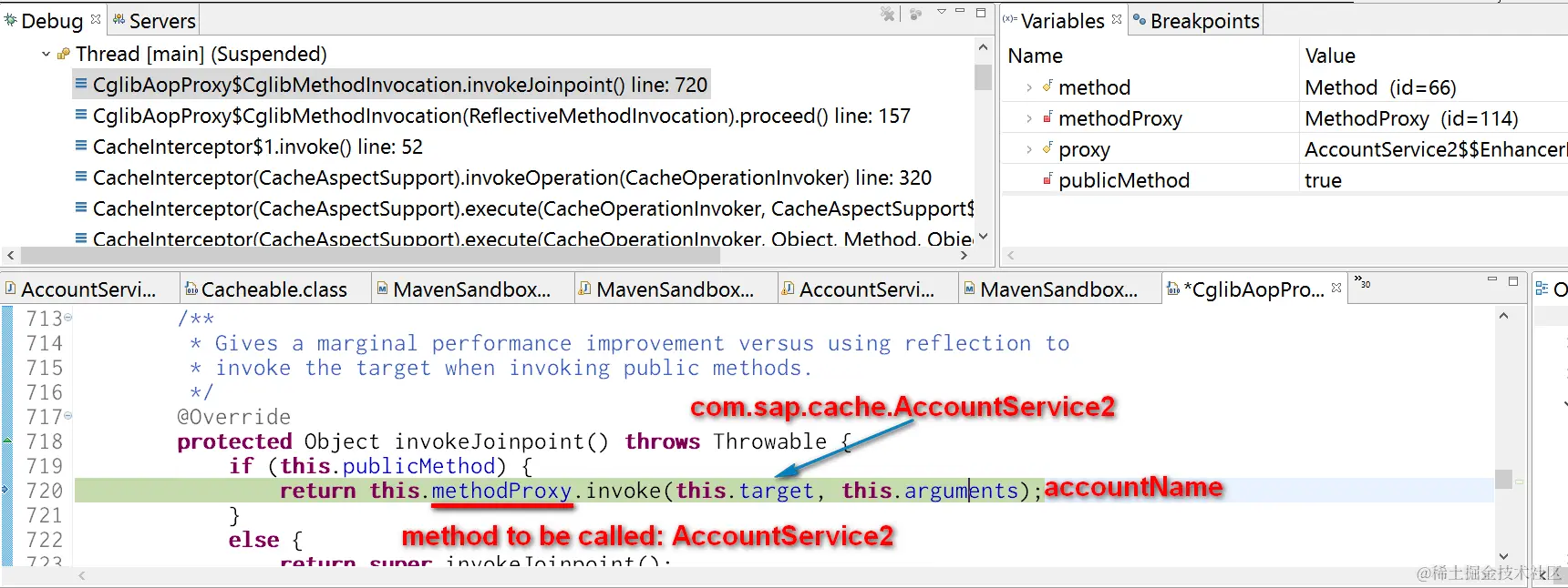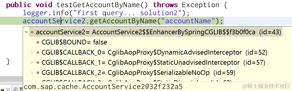 Here in line 31, in debugger we can find that accountService2 is not an instance of application class com.sap.AccountService2, but a dynamic proxy class generated by Spring.