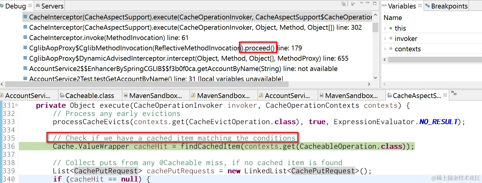 First internal cache managed by Spring is checked in line 336 via method findCachedItem. Due to expected cache miss, our application method will be called as usual via reflection, as demonstrated below: