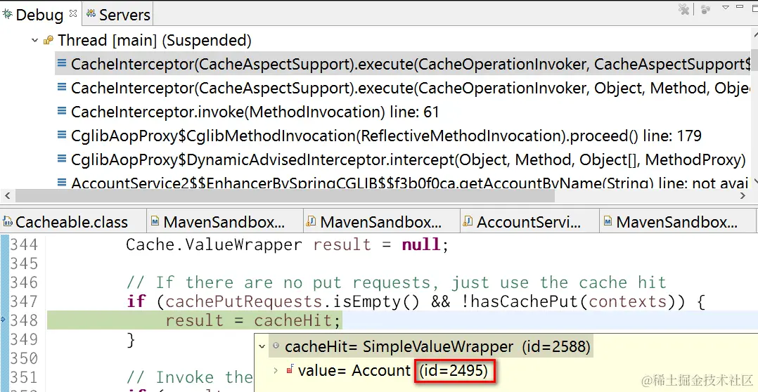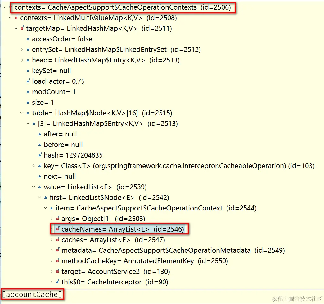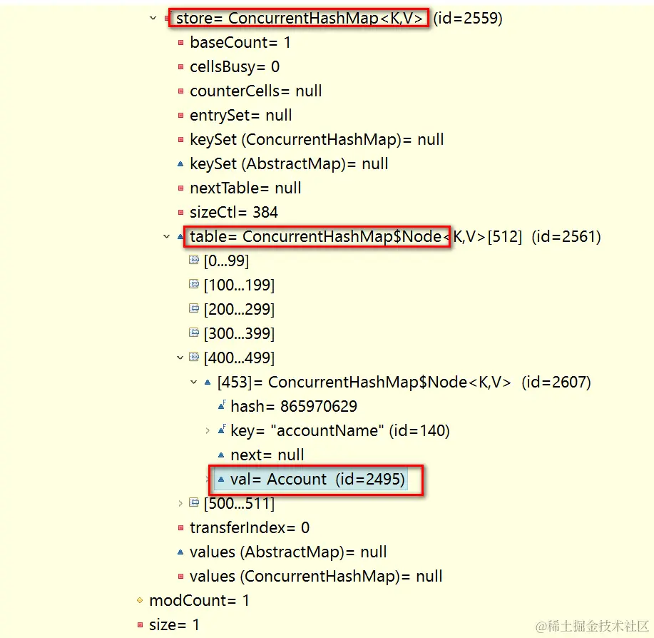 Below is the screenshot for Spring internal cache to store application data, which is based on ConcurrentHashMap. Our cached Account instance with id 2495 could be found there.