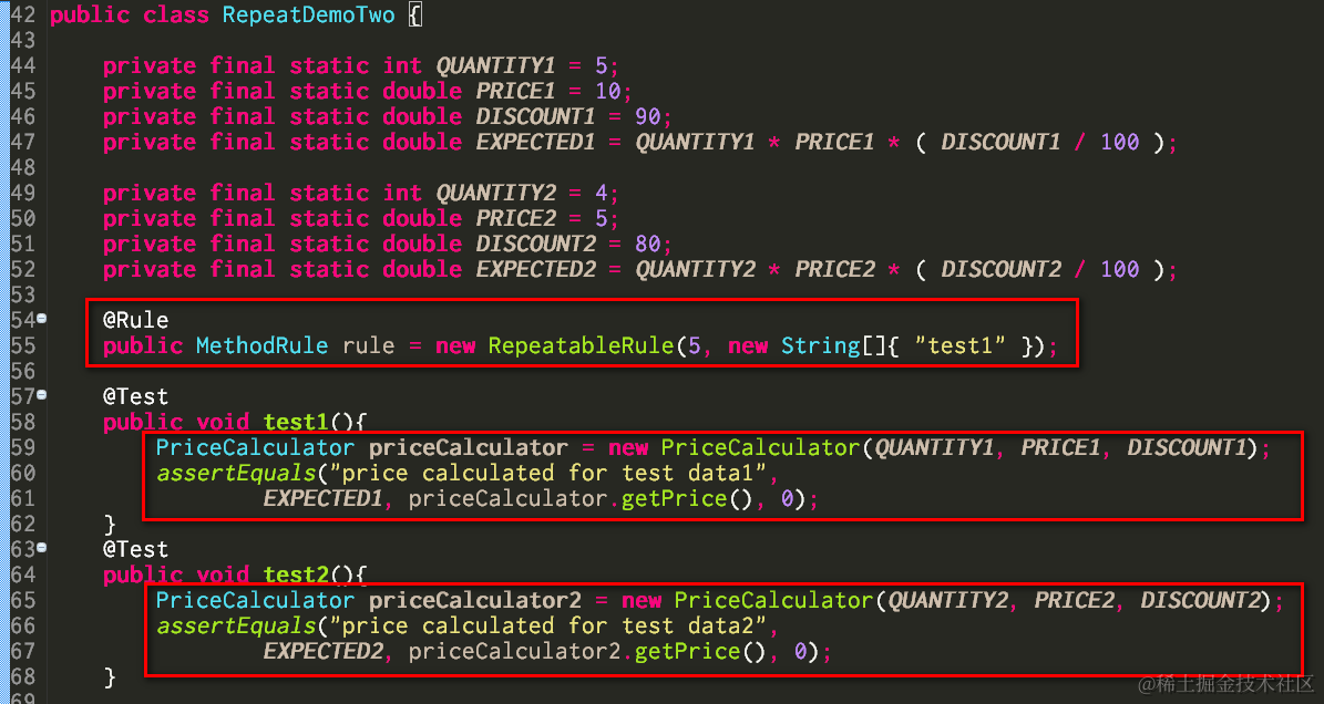 Suppose you need to repeatedly execute some test method in your unit test case, for example, you would like to test getPrice based on the first set of test data 5 times in test method test1() while for the second set of test data, only one time should be executed.