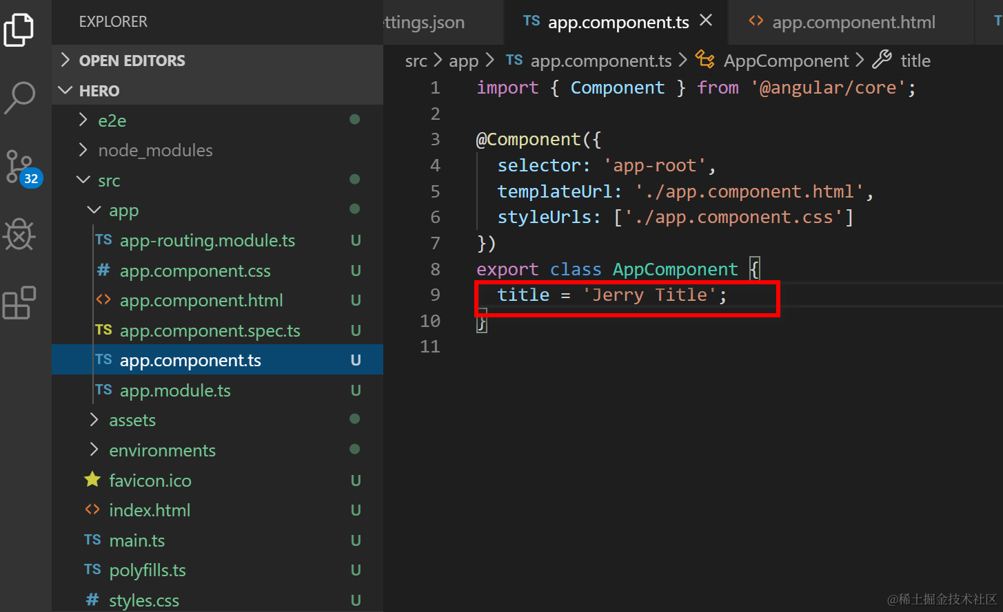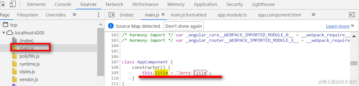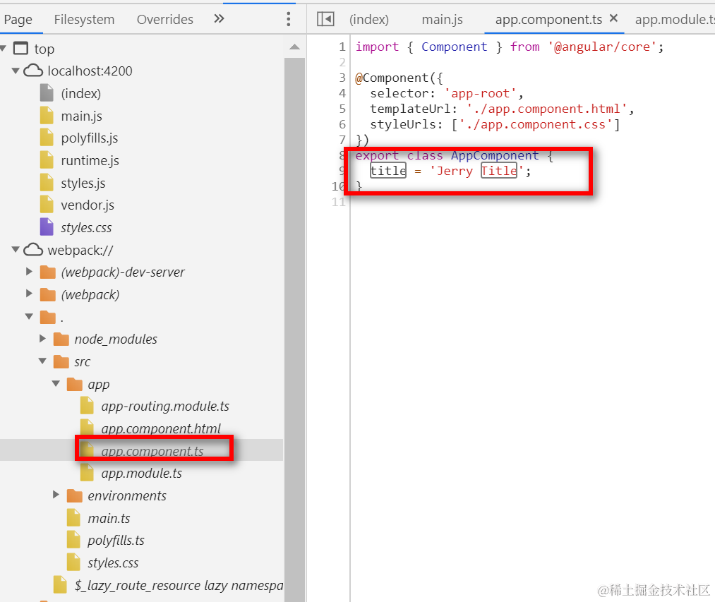 Angular export class AppComponent里定义变量的实现原理 已注销 2021-04-26 197 阅读1分钟 我在Angular项目的app.component.ts使用export class定义了一个Component,在大括号里声明了一个title属性(property): 这个TypeScript转换成对应的JavaScript文件的源代码如下图所示: 在Chrome开发者工具里的webpack文件夹下,可以同时看到转换之前的TypeScript代码和转换之后的JavaScript代码(main.js): 要获取更多Jerry的原创文章,请关注公众号"汪子熙":