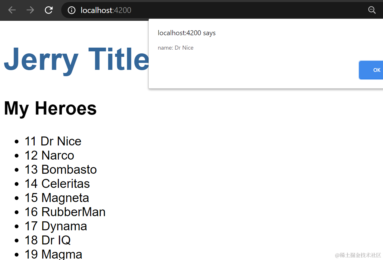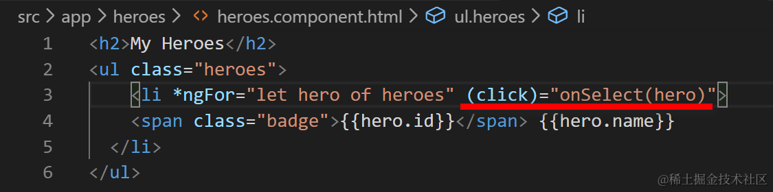 (click)告诉Angular,监听li元素的点击事件。当用户点击li时,Angular执行onSelect(hero).