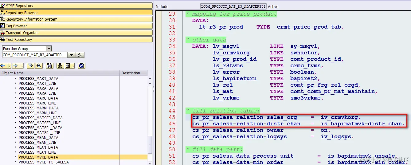 After fill, there is a check performed by CRM_PR_SALES_CHECK_DISTR_CHAIN. In my example, the check passes since the distribution channel 01 is already maintained in this CRM sales organization.
